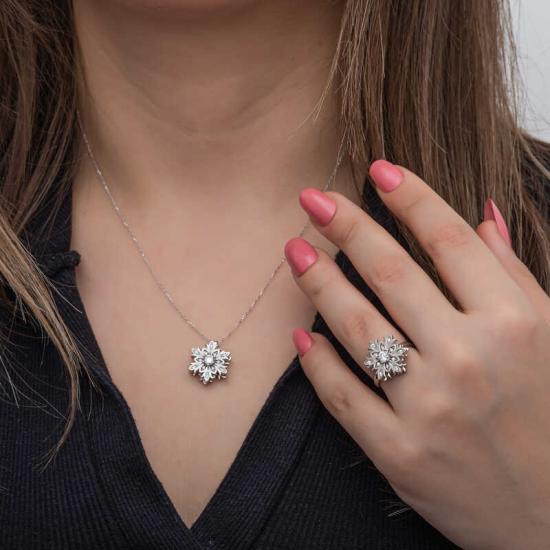 Kadınların ışıltısı, berraklığı kar tanesine benzetilip özel olarak tasarlanmıştır. Kar tanelerinin her birinin kadınlar gibi eşsiz ve ayrı kıymette olması onları özel kılan bir diğer özelliktir. Asilliği her dönemde dikkat çekmeyi başarmıştır. Bunun yanında insanların tıpkı kar taneleri gibi birbirlerine zarar vermeden de mutlu bir şekilde yaşayabileceklerini sembolize etmektedir. Bu şık set; doğum günü hediyesi, sevgililer günü hediyesi veya annelere hediye olarak özel günlerde tercih edilebilecek mükemmel bir seçenektir. Set, 925 ayar gümüşten imal edilmiştir. Gümüş üzerine rodyum kaplama yapılmıştır. Rodyum kaplama yapılan gümüş kadın set modelleri parlaklığını uzun süre muhafaza eder, oksitlenmesi gecikir. Tüm gümüş kadın set modellerinde olduğu gibi bu gümüş ayarlanabilir kar tanesi dönen stres kadın set de tamamı el emeği ile üretilmiştir. Gümüş ve değerli taşlar nedeniyle belirtilen ortalama ürün ağırlığında ± %10 sapma olabilmektedir.